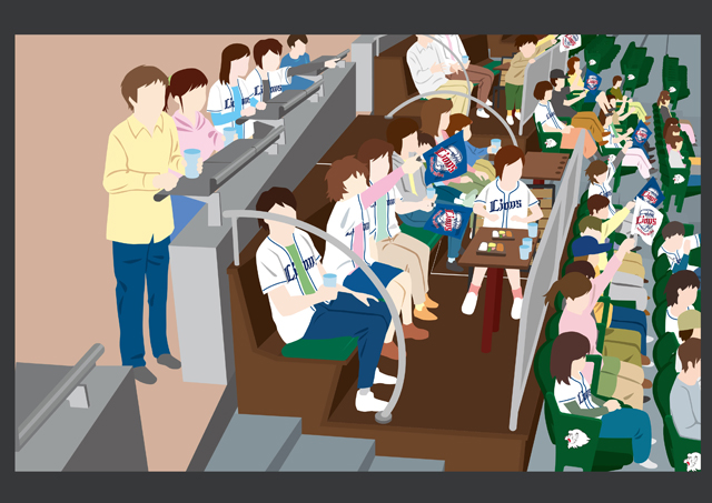 内野指定席1塁側の上段部に位置するグループシート(定員4名まで)で、球場全体を見渡しながら、ご家族やご友人とともに野球観戦をワイワイとお楽しみいただけます。
