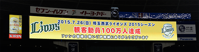 埼玉西武ライオンズは、本日7月26日(日)対北海道日本ハムファイターズ戦にて、今シーズンの主催公式戦の観客動員数累計が100万人を突破いたしました。