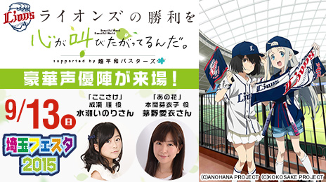 当日は、「心が叫びたがってるんだ。」(通称:ここさけ)成瀬 順役の水瀬 いのりさん、「あの日見た花の名前を僕達はまだ知らない。」(通称:あの花)本間 芽衣子役の茅野愛衣さんが、西武プリンスドームに来場し、始球式などを実施。