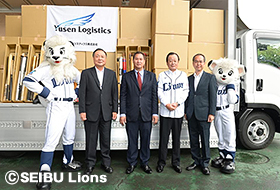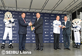 9月26日(土)試合前に、代表取締役社長の居郷肇と専務取締役の関洋二から、カンボジア大使館のエンさま、輸送を担当していただく郵船ロジスティクス株式会社 古徳さまへ用具が手渡され、カンボジアへ向けて西武プリンスドームを出発いたしました。