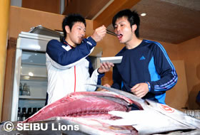 また、恒例となった夕食時のキハダマグロの解体ショーでは、昨年と今年のドラフト1位菊池・大石両投手がお手伝い。本日、日南沖で獲れたキハダマグロのお刺身約200人分が振舞われました。
