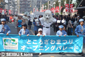 MY PAGE10月9日(日)、所沢駅西口周辺で開催されました「ところざわまつり」パレードに埼玉西武ライオンズマスコットキャラクター“レオ”が参加いたしました。