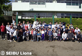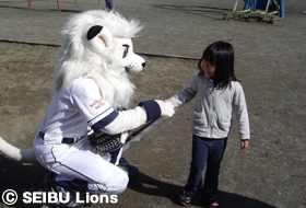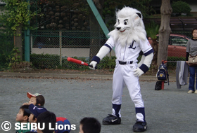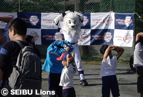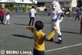 前日からの雨が心配されましたが、球団マスコット『レオ』もお手伝いに参加して、秋晴れのもと、疲れを知らず校庭を元気に走る回る児童の様子が大変印象的でした。