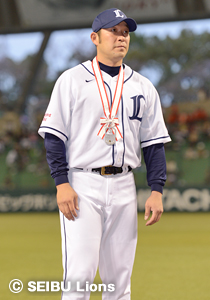 3月31日(土)北海道日本ハム戦(札幌ドーム)で、嶋選手が通算1,000試合出場を達成し、4月16日(月)の試合開始前に、その偉業を讃え表彰式が行われました。
