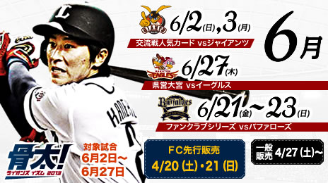 4月20日(土)・21日(日)は、人気の巨人戦(6/2,3)や大宮開催(6/27)を含む、6月開催試合分のファンクラブ会員限定先行販売日です。