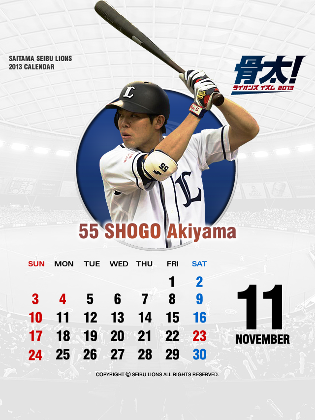 11月の壁紙・待受けカレンダーは、2013シーズン、主に5番を任され、プロ3年目で初めて全試合出場を果たした秋山選手デザインです!