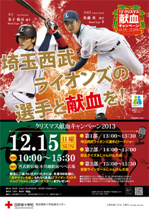医療機関で輸血を必要としている患者さんのために、献血者が減少する冬期に輸血用血液の確保をするべく、より多くの方に献血に協力していただけるよう、地元・埼玉県の代表として、また若者の代表として、ライオンズのルーキー2選手が献血の意識高揚と大切さを呼びかけます。