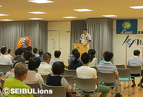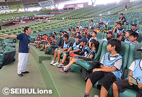 当日は小学生80名が参加し、試合開始前のライオンズの練習見学後、ライオンズアカデミー岡村隆則校長、星野智樹コーチを講師として、「プロ野球選手になるために大切なこと」をテーマに講演を行い、こどもたちは貴重な話に熱心に耳を傾けていました。今回の体験を通じて、プロ野球選手だけではなく、こどもたちがそれぞれの夢を叶えるためのきっかけとなれば幸いです。