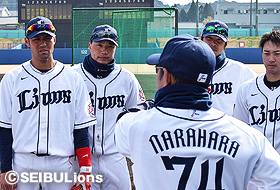 シート打撃後にコーチの話を聞く選手たち