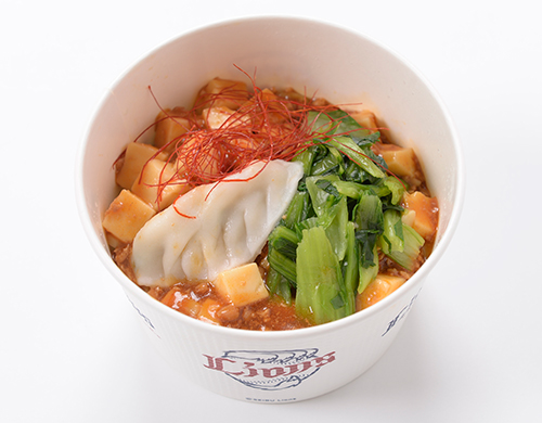 森本選手プロデュース「ひちょりのチョリ麺」は、ごま油を絡めた麺の上に麻婆豆腐をたっぷりかけ小松菜・水餃子をトッピングしたオリジナルグルメ。森本選手自ら、麺や油を試食し完成させた一品です。