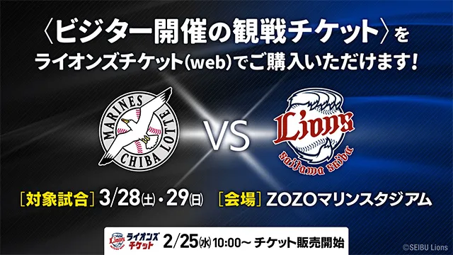 チケット2026/02/12 (木)【2/25(水)10時~】3/28(土)・29(日)千葉ロッテ戦(ZOZOマリン開催)のチケットをライオンズチケット(web)で販売! -