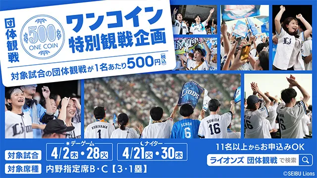 チケット2026/01/26 (月) NEW!【ワンコイン特別観戦企画】4月4試合限定で団体観戦が1名あたり500円! -