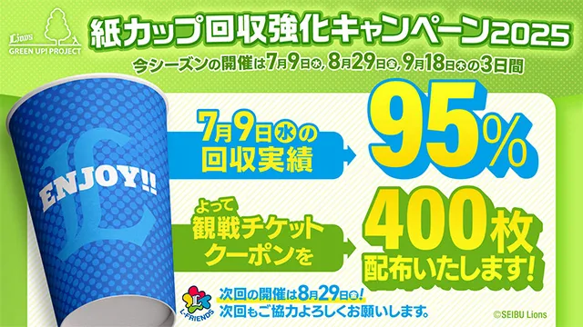 L-FRIENDS2025/06/30 (月)Lions GREEN UP! プロジェクトとして、7月から『紙カップ回収強化キャンペーン2025』をスタート!