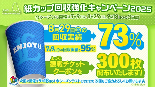 L-FRIENDS2025/07/11 (金)【Lions GREEN UP! プロジェクト『紙カップ回収強化キャンペーン2025』】7/9(水)の回収率実績は⁉ -