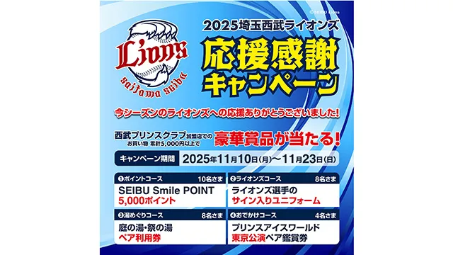 西武グループ2025/11/10 (月) NEW!西武グループ各施設にて『2025埼玉西武ライオンズ応援感謝キャンペーン』開催! -