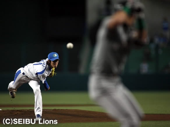投手 武田勝 5番 G.G.佐藤 左中二 初球、外角のボールを力強く引っ張った打球は左中間を抜ける大きな当たり |