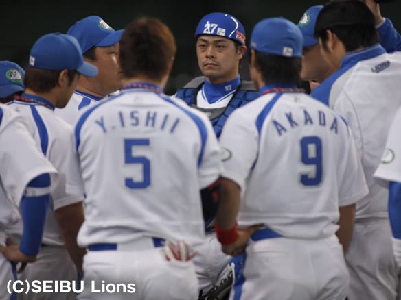 小野コーチがマウンドへ 内野陣が集まり入念な打ち合わせ 涌井任せたぞ! |