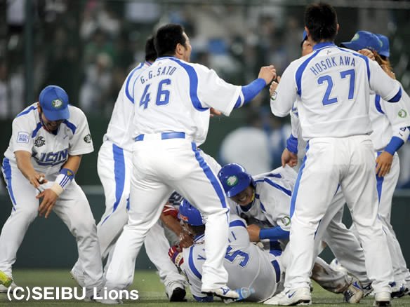 石井義決めたサヨナラ! 2塁ベース付近でもみくちゃ!! 粘った粘った涌井に勝利。涌井は一目散にベンチを飛び出し、勝利に喜ぶ!! |