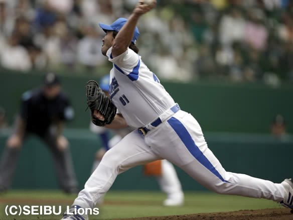 投手 石井 5番 スレッジ 空三振 2-2からの7球目、外に逃げていくスライダーに空振り! |
