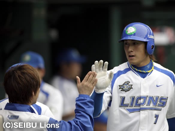 5番 G.G.佐藤 三ゴ失 三塁線へ際への打球がフェアになる サード・陽が捕って2塁に投げるも暴投 になり、その間に3塁まで走っていた片岡が生還! 2塁ランナー・ブラゼルも3塁へ |