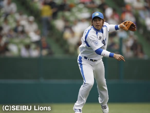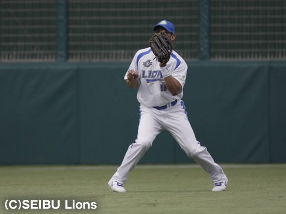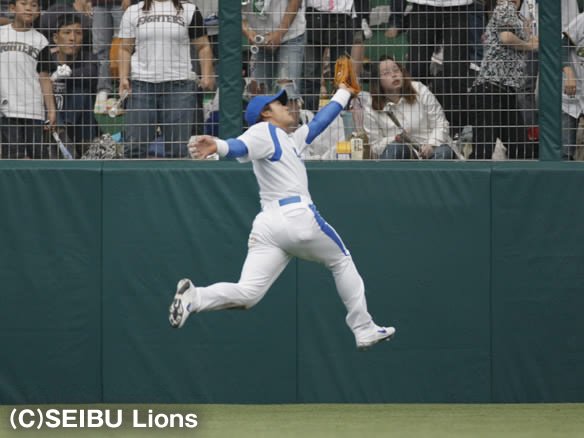 投手 石井 1番 森本 右飛 ライト線ポール近くまで飛んだ打球 G.G.佐藤がフェンスギリギリで捕球し、そのままフェンスにドスン |
