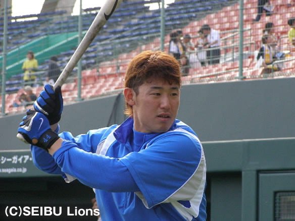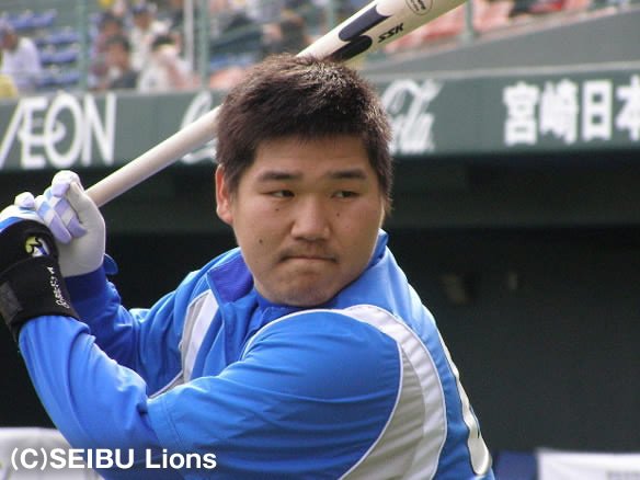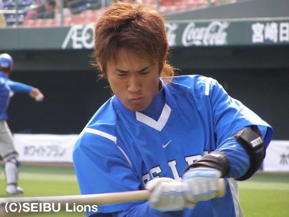 5番 G.G.佐藤 左翼二 かなり高めのストレートをレフトフェンス直撃! ブラゼルは懸命に走ってぎりぎり3塁へ! |