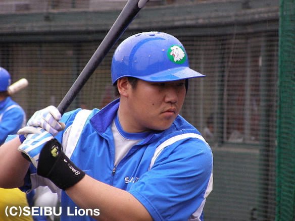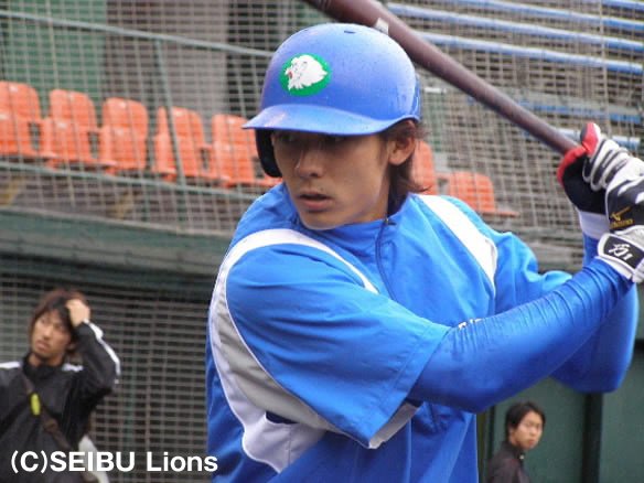投手 青木勇 5番 G.G.佐藤 中飛 初球内角高めストレートを振り抜くもセンター・赤松が捕球 |