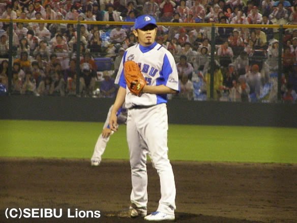 投手 大島 5番 G.G.佐藤 二飛 かなり高めのストレートを打ち上げてしまう。セカンド・東出がライト方向まで下がって捕球 |
