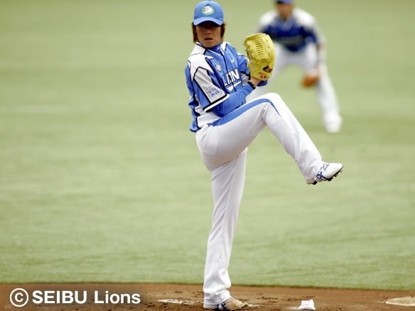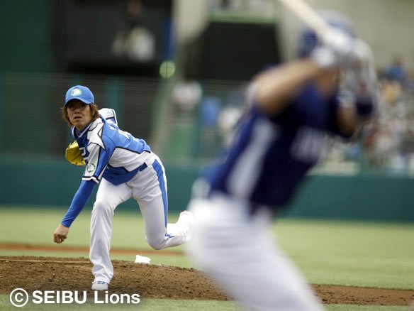 投手 帆足 ライオンズ先発は、いまだ負けなし、開幕から5連勝中の帆足。 いつものように、マウンドでバックスクリーン方向を見て精神統一を行う。 ボールに力をこめる。 |