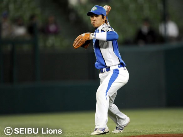 2番 仁志 遊ゴ 外角低めの変化球を三遊間に引っ張る。 ショート・中島が回りこんで捕球 |