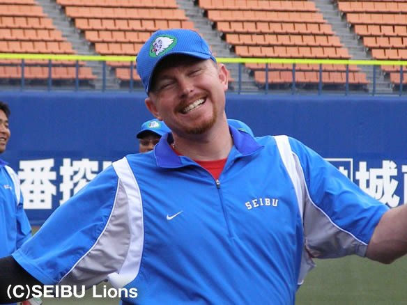 投手 ウッド 5番 G.G.佐藤 一安 引っ張ろうとしたが打球はあっち向いてほいの一二塁間へ。スタートが遅れたが、ピッチャー・ウッドがカバーに入れずセーフ! |