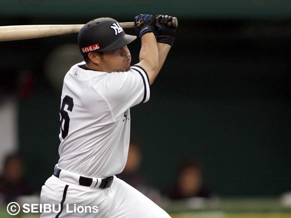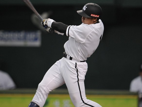 5番 G.G.佐藤 左安 内角高めのボールに差し込まれるも、打球はレフト左に! |
