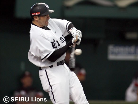 5番 G.G.佐藤 二ゴ 外角スライダーを捉えきれず |