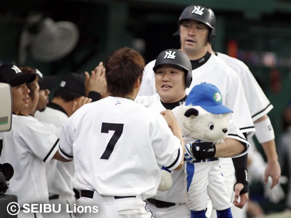 西口と後藤がしっかりと握手。 ライオンズ 西鉄ユニフォームで勝利を飾る!! |