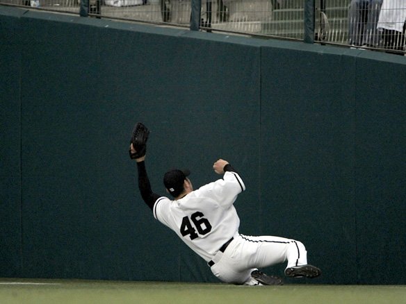 2番 オーティズ 右飛 ライトフェンス際への当たりもG.G.佐藤がフェンスにぶつかりながらスライディングキャッチ!!守備率100%のファインプレー!! |