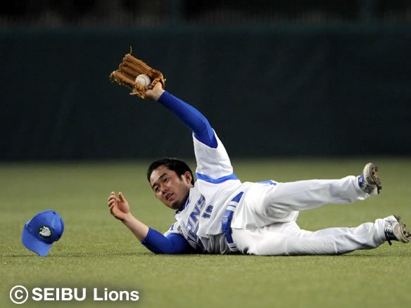 5番 G.G.佐藤 左飛 外角のスライダーを引っ張るもレフト定位置へのフライ。2塁ランナー・中島が3塁へタッチアップ。 |