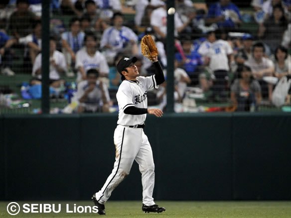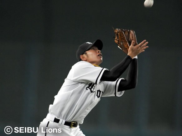 投手 岸 3番 田中賢 遊飛 内角高めのスライダーを打ち上げる。レフトとショートが追いかけ、最後はショート・黒瀬が後ろ向きにキャッチ! |