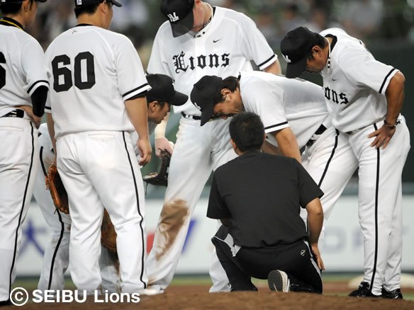 投手 石井一 石井一、治療のためベンチに下がり一時中断 |
