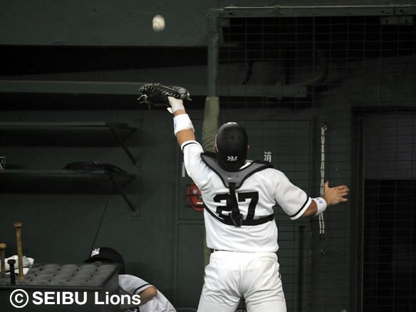投手 石井 4番 小久保 捕邪飛 高々と天井付近まで上がった打球をキャッチャー・細川が1塁ベンチ前すれすれでナイスキャッチ!! |