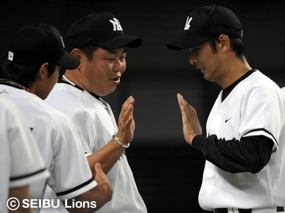 満塁のピンチを抑えた西口を迎える大久保コーチ