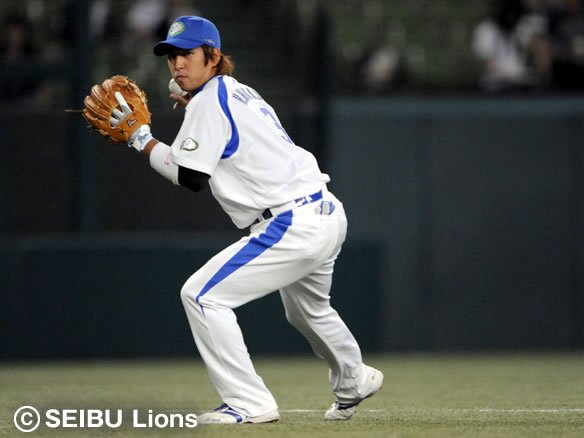 投手 岩隈 1番 片岡 二ゴ 2-0から外角低めのスライダーを一二塁間に流すもセカンド・高須が回りこんで捌く |
