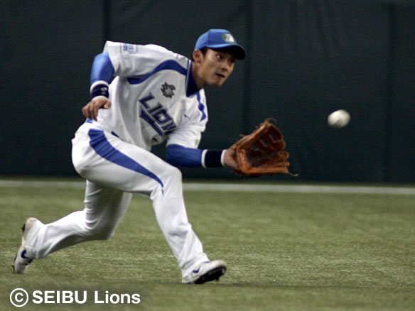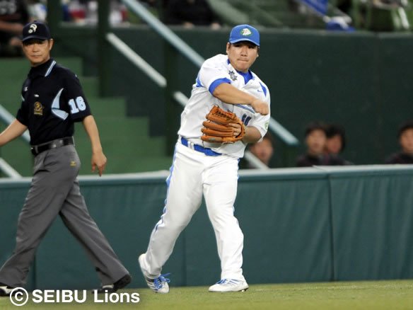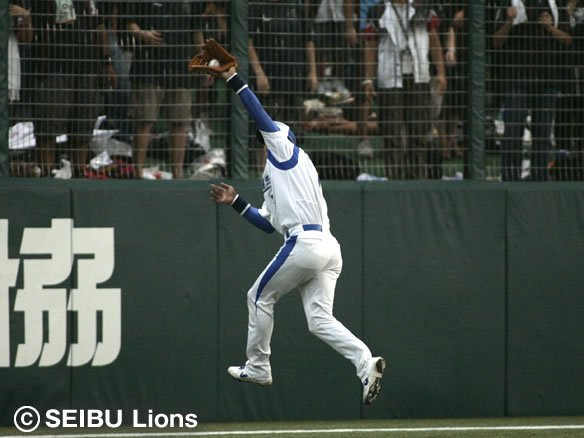 2番 オーティズ 右飛 2-2から内角高めのストレートに詰まらせ、中島、赤田、佐藤が追って、ライト・佐藤が捕球 |