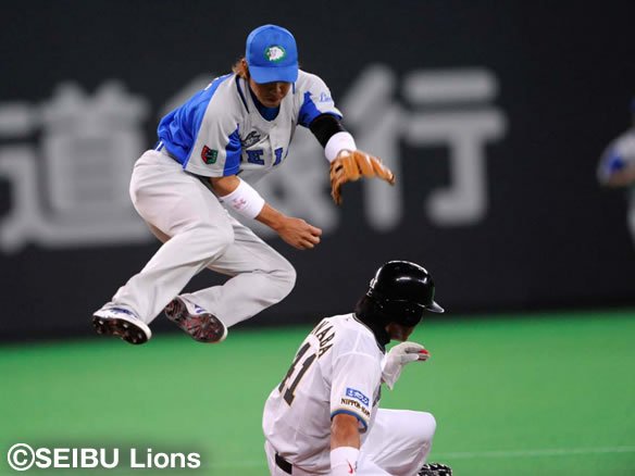 3番 稲葉 二ゴ 0-2からど真ん中のスライダーを詰まらせた当たり。セカンド・片岡が回りこんで捕り2塁カバーの中島にトス!4-6-3のダブルプレーを狙うも中島から1塁への送球が逸れてしまい、ファースト・石井義は捕球できず。その間に稲葉は2塁へ |