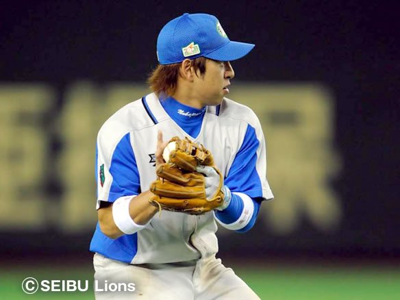 投手 上原 2番 栗山 二ゴ 2-1から外角低めのフォークを掬い上げるようにして一二塁間に運ぶもセカンド・木村拓が回りこんで捌く |