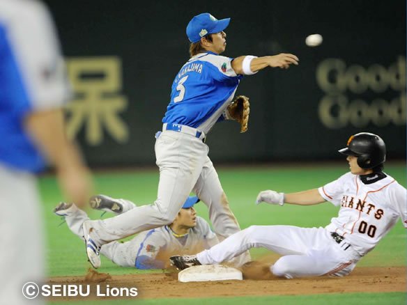 3番 小笠原 二ゴ 二塁右への打球もセカンド・片岡が飛び込んで止め、2塁カバーの中島にトス!!4-6-3のダブルプレーを狙うも1塁はセーフ |