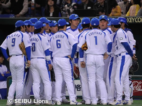 大久保コーチを中心に円陣を組んで気合いを入れるライオンズナイン