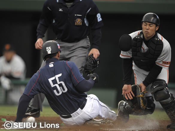 4番 中村 左翼二 0-1から引っ張った打球が3塁線を襲った!打球はそのままファールゾーンのフェンスに当たってレフトへ転がった! 1塁ランナー・ボカチカは懸命に走り、迷わず3塁を蹴って本塁突進!ライオンズ、勝ち越し!5対4。 ![]() 5