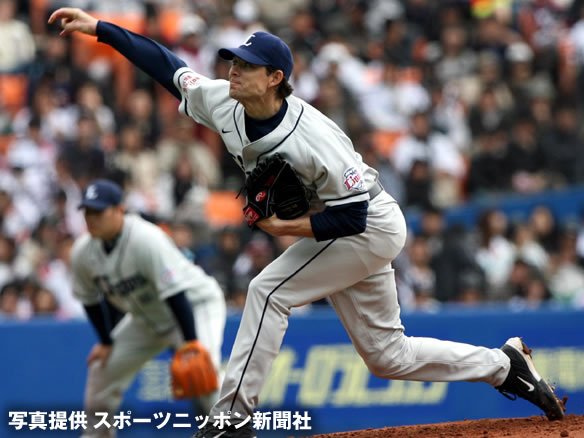9番 根元 二ゴ 1-1から打ち損じさせ、打球はセカンド・片岡の正面。片岡は2塁ベースカバーのショート・中島にトスし、1塁ランナーのサブローがフォースアウト。 |