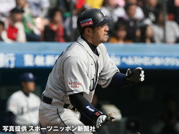 6番 G.G.佐藤 左飛 1-0から鋭い打球を弾き返したが、レフト・大松に追いつかれた・・・。 |