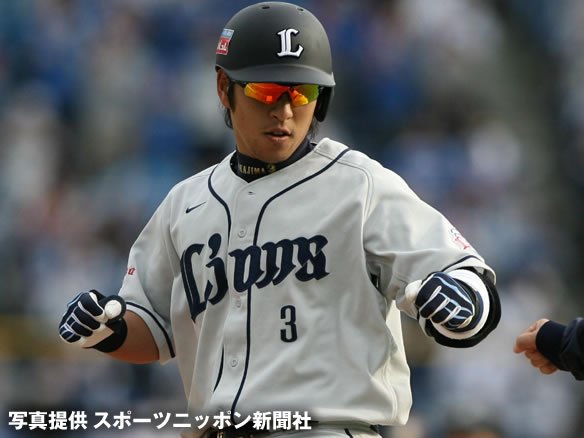 6番 G.G.佐藤 右中二 1-1から真ん中に入ったスライダーを叩き、打球は右中間の真ん中を破ってフェンスに到達! この間に1塁ランナーの中島は2塁、3塁と蹴り、一気にホームイン! 5対5の同点!! ![]() 5